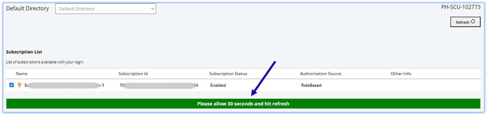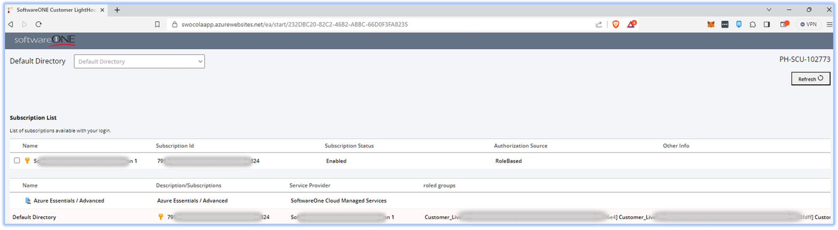6 | Under Service Provider, you should see SoftwareOne Cloud Managed Services and under roled groups, Customer_<Customer Company Name>Azure_RO[Guid] & Customer_<Customer Company Name>Azure_RW[Guid]. Repeat steps 4 & 5 for succeeding subscriptions. ![]() |