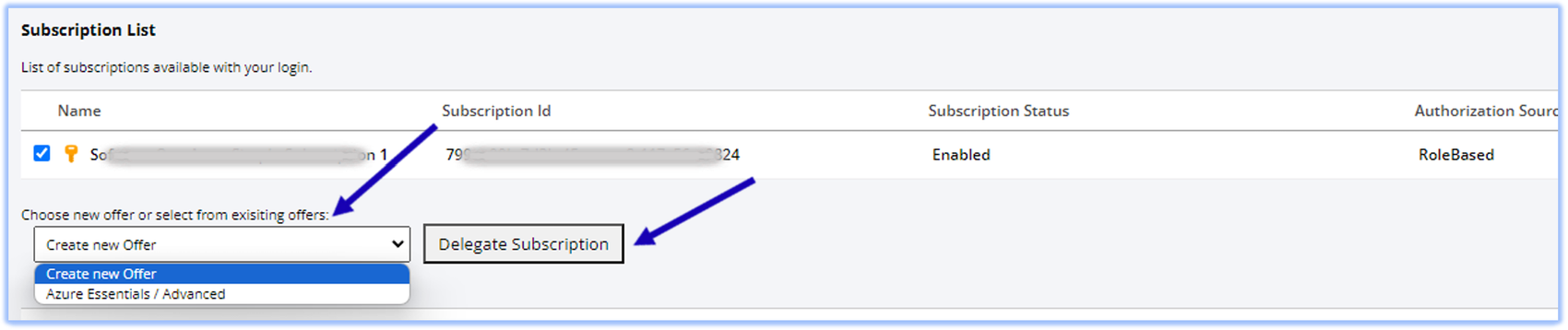 4 | Under Subscription List, click on the tick box beside the first subscription (only 1 subscription can be onboarded at a time). Under the Choose new offer or select from existing offers dropdown, select Azure Essentials / Advanced. Click on Delegate Subscription. ![]() |