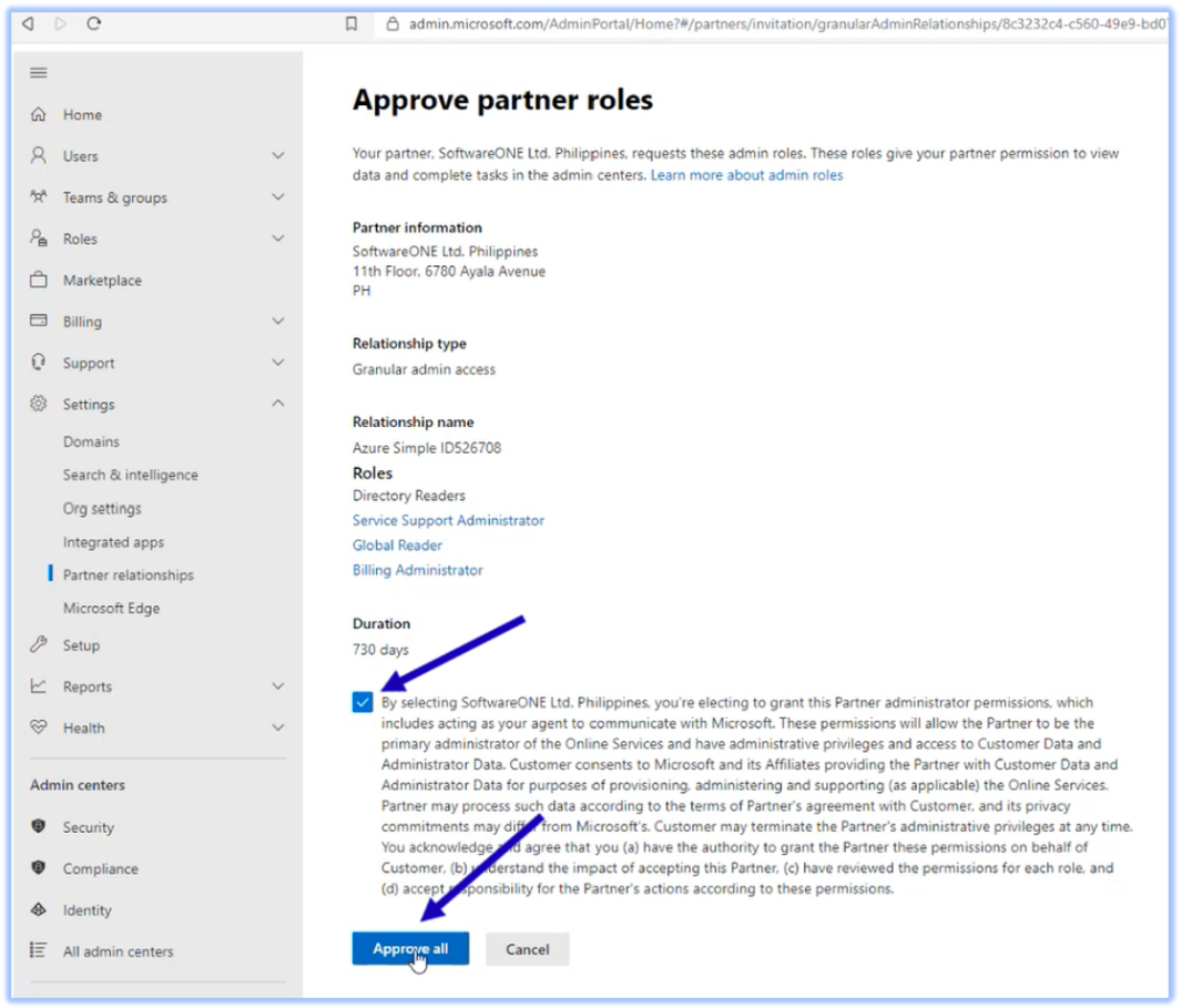 3 | Under the Approve partner roles, review the Partner information, Relationship type, Relationship name, Roles, Duration. Then click on the tick box which says By selecting SoftwareONE Ltd. Philippines you're electing to grant this partner administrator permissions. which includes acting as your agent to communicate with Microsoft. These permissions will allow the Partner to be the primary administrator of the Online Services and have administrative privileges and access to Customer Data and Administrator Data. Customer consents to Microsoft and its Affiliates providing the Partner. With Customer Data and Administrator Data for purposes of provisioning administering and supporting (as applicable) the Online Services. Partner may process such data according to the terms Of Partner's agreement with Customer. and its privacy commitments may differ from Microsoft's. Customer may terminate the Partner's administrative privileges at any time. You acknowledge and agree that you (a) have the authority to grant the Partner these permissions on behalf of Customer. (b) understand the impact of accepting this Partner, (c) have reviewed the permissions for each role, and (d) accept responsibility for the partners actions according to these permissions. Click on Approve all. ![]() |