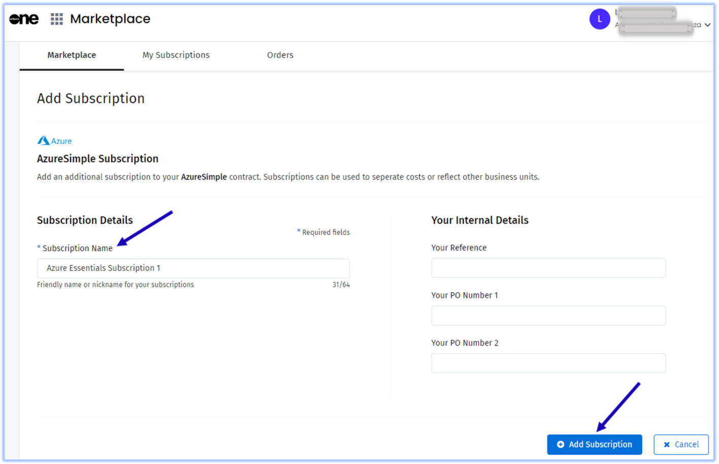 6 | Under Subscription Name, specify your preferred name for your Azure Subscription. Click on the +Add Subscription button. ![]() |